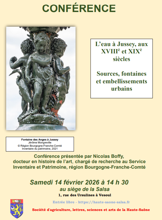 Samedi 14 février 2026 à 14h30 dans les locaux de la SALSA, Nicolas Boffy, docteur en histoire de l’art, chargé de recherche au service de l’Inventaire du Patrimoine de la région Bourgogne-Franche-Comté, présentera une conférence :