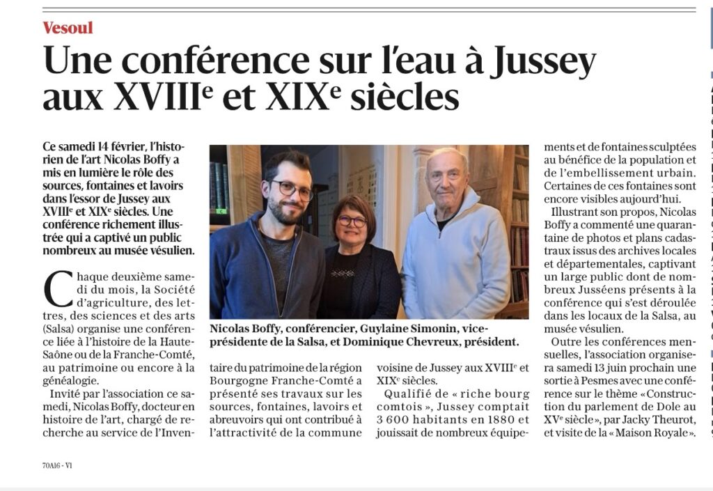 Samedi 14 février 2026, Nicolas BOFFY a passionné les adhérents de la SALSA avec une conférence sur « L’eau à Jussey aux XVIIIe et XIXè siècle ».